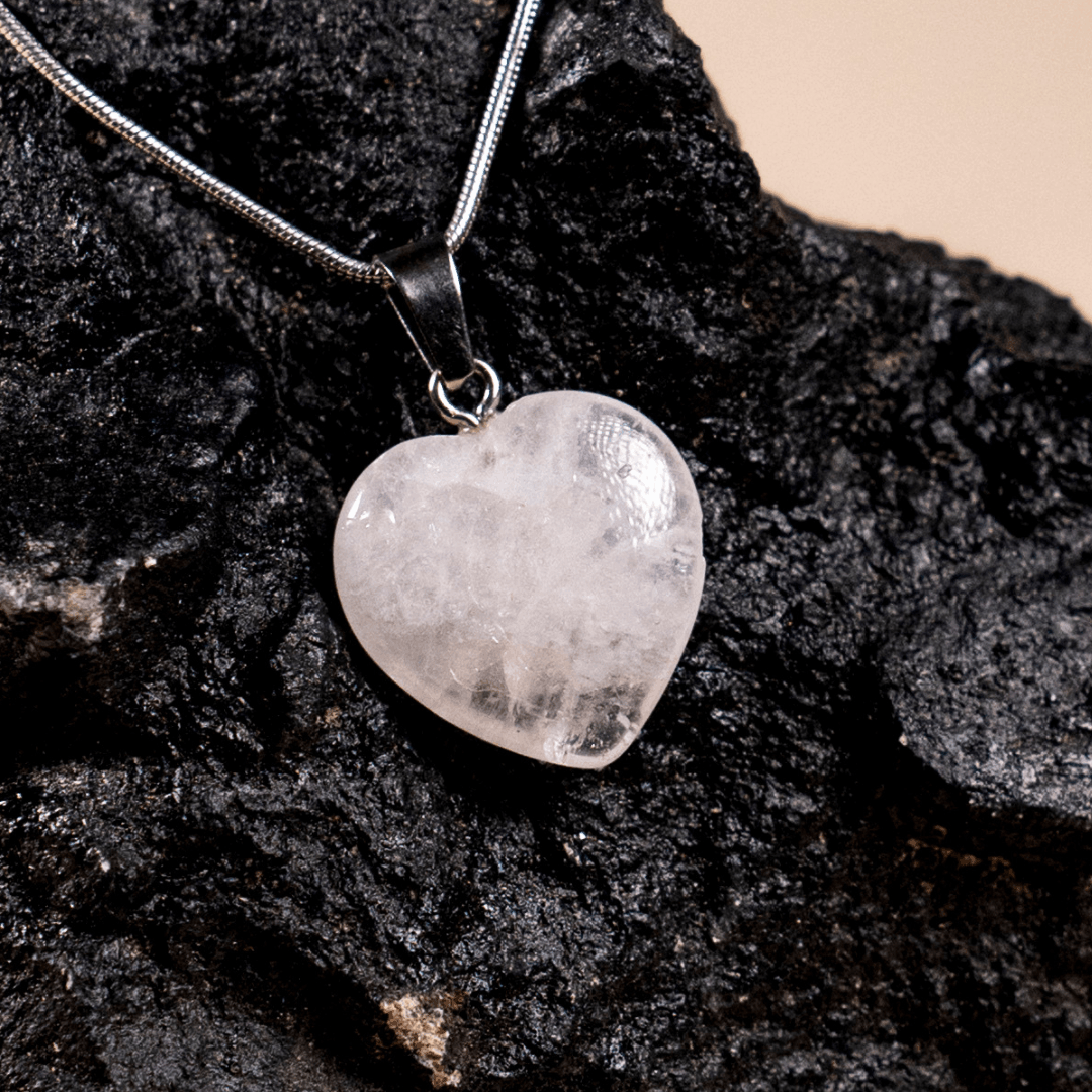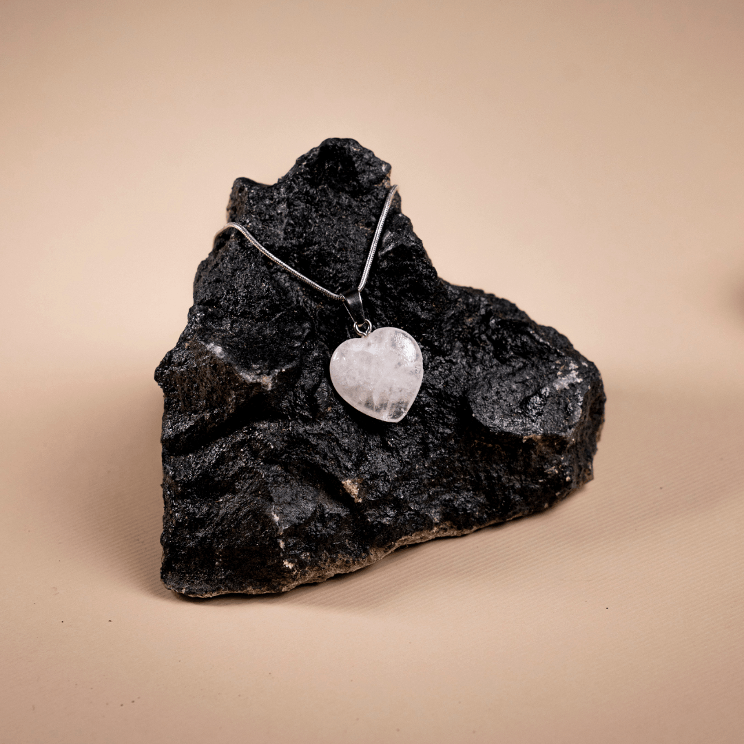 The heart shape symbolizes the infusion of love and compassion into the stone's natural clarity, making it a perfect tool for balancing the emotional and spiritual planes. Suspended on a delicate silver-tone chain, this pendant is not just a versatile accessory but a powerful energetic instrument that amplifies your intentions and the effects of other crystals you may wear.